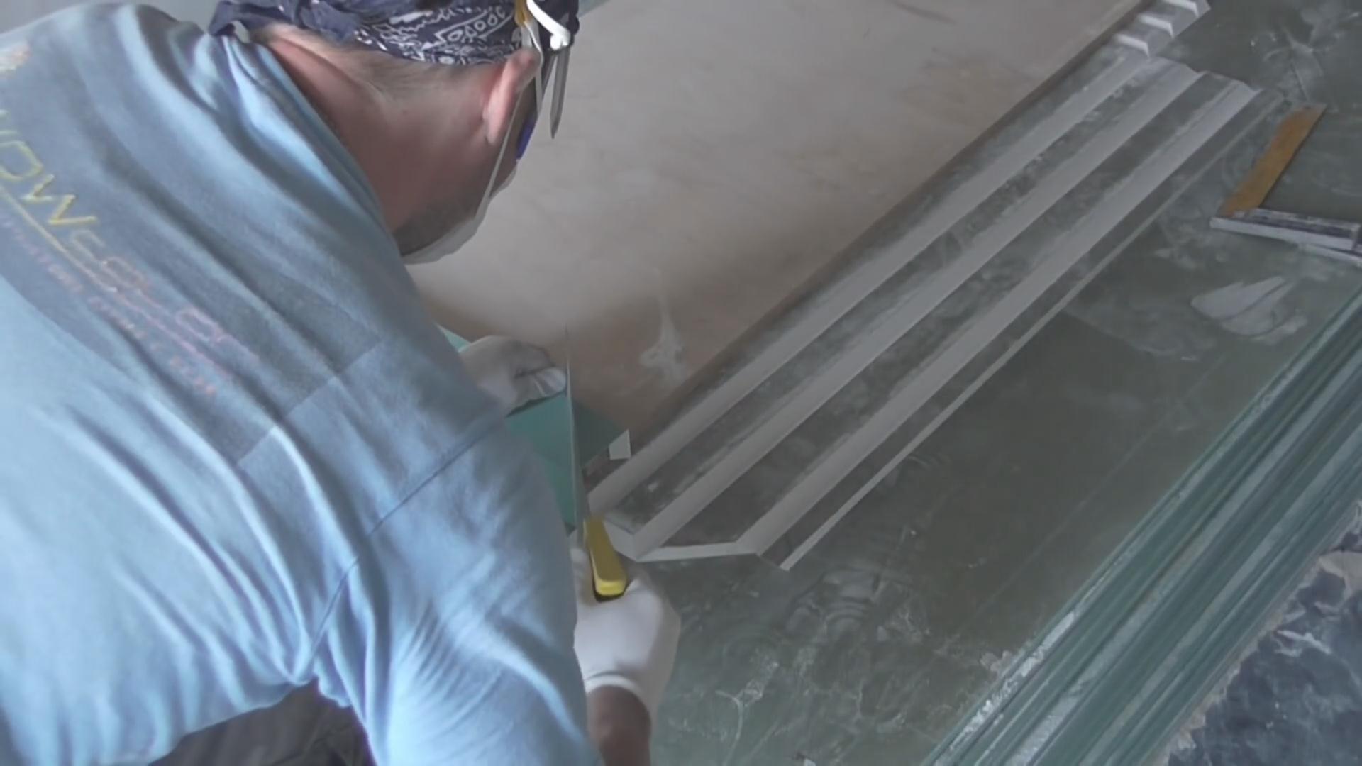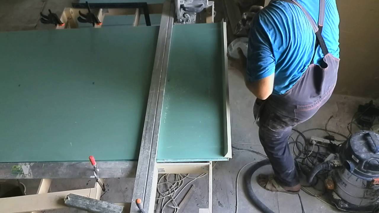 - La préparation - lors de cette étape, différents modèles et mesures sont créés pour obtenir des lignes de pliage lisses. Ils sont généralement créés à partir de matériaux de récupération: contreplaqué ou métal.Les modèles sont fixés directement sur la cloison sèche à l’aide de vis autotaraudeuses et, reposant sur le modèle, le routeur offre une coupe uniforme. À ce stade, le râteau est généralement coupé - sa largeur est égale à celle du bord du moulin au centre de la fraise. C'est la bonne partie pour l'emplacement le plus précis de l'équipement.