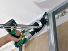 - Avec profilé métallique. Les Reiki sont utilisés pour créer un cadre pour la construction future. La base des profils est collectée en fonction des besoins du consommateur. Le cadre peut être sous la forme d'une boîte simple ou d'un design complexe à plusieurs niveaux. Après avoir créé un squelette en métal, des feuilles de gypse sont fixées à celui-ci. Cette méthode nécessite une précision particulière, vous devez soigneusement mesurer chaque détail et les attacher exactement les uns aux autres.En cas de distorsion du produit à partir de la cloison sèche, le résultat sera négligeable.