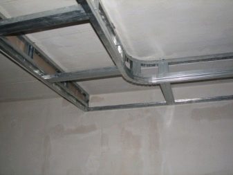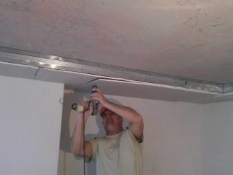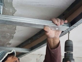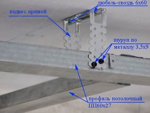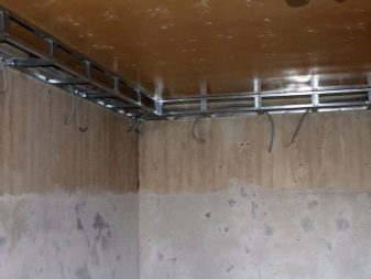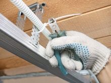 - Après cela, vous pouvez commencer à couper les suspensions, leur longueur doit correspondre à la profondeur de la boîte. Fixez les cintres nécessaires en fonction des marques sur la surface du plafond. Ils sont nécessaires si la distance entre les futurs murs de la boîte dépasse 60 cm.