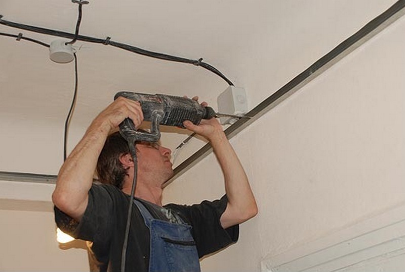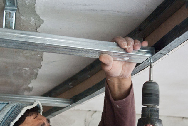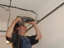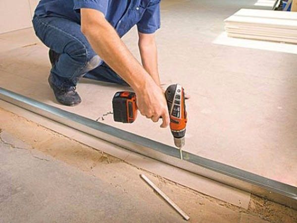 - Les trous pour les chevilles sont percés sur la ligne de fixation située au mur à l'aide d'un perforateur ou d'une perceuse. Ils devraient coïncider avec les trous dans le profil. Des artisans expérimentés fixent le profil directement à la surface sans avoir à percer le profil et le mur. Ensuite, le profil UD est monté au plafond.