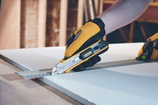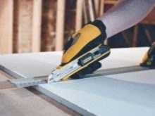 - Couper les plaques de cloison sèche aidera ordinaire couteau à peindre avec une lame de longueur réglable et réglable. À l'aide d'une râpe, les bords rognés de la plaque de plâtre sont mis à niveau et la raboteuse permet de supprimer un chanfrein soigné des bords rognés et d'extrémité de la feuille.