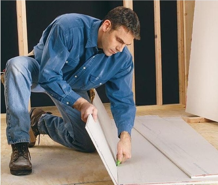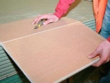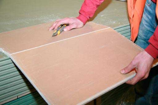- Afin de casser la couche de plâtre de manière uniforme, la feuille doit être placée soit sur la surface, de manière à ce que la partie coupée pende, ou sur le bord. La couche de carton restante est coupée en tournant la feuille.