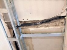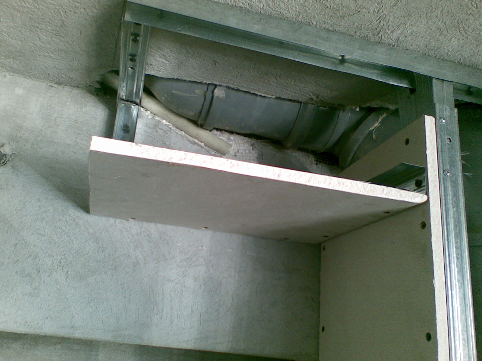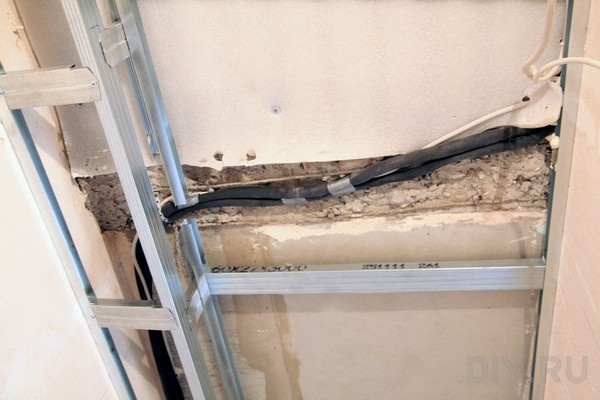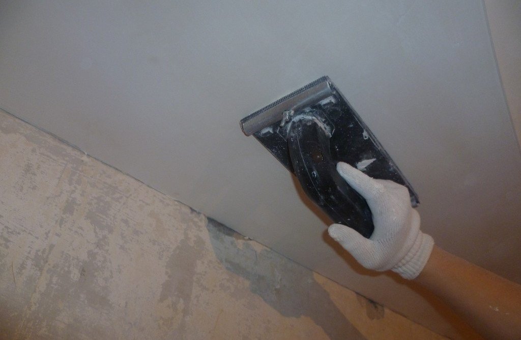 Tout d'abord, vous devez nettoyer le chantier des anciens matériaux de finition. Ensuite, faites des trous de mastic et des fissures sur la surface du plafond et près des entrées des tuyaux.