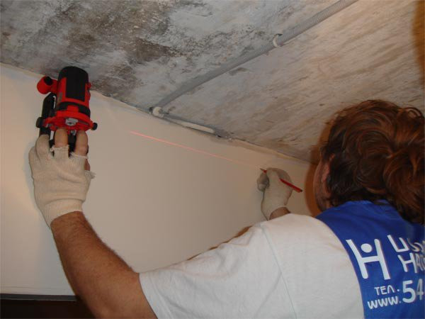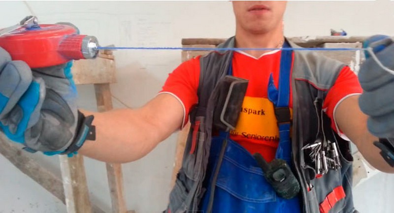 Pour décrire le niveau souhaité du cadre, vous pouvez utiliser différents moyens, mais il est plus pratique d’utiliser un fil à colorant, que vous devez d’abord tirer puis lâcher brusquement, afin qu’une ligne claire apparaisse à la surface. Mais vous ne pouvez utiliser cet outil pour le dessin de contour que si vous envisagez d'installer un conduit droit. Pour la pièce du produit devra dessiner les contours à la main.