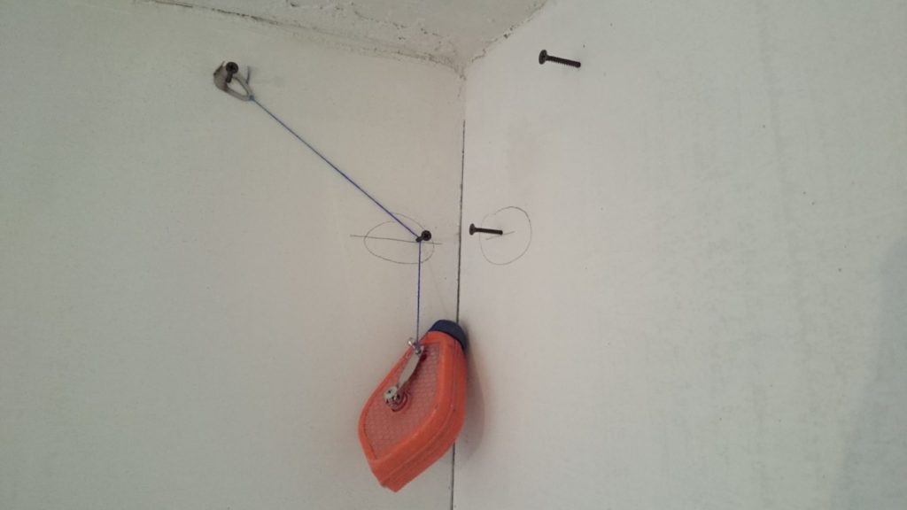 Afin de faire la première marque, vous devez déterminer l’angle avec l’emplacement le plus bas et, en mesurant la distance souhaitée, placer des points sur les deux murs.