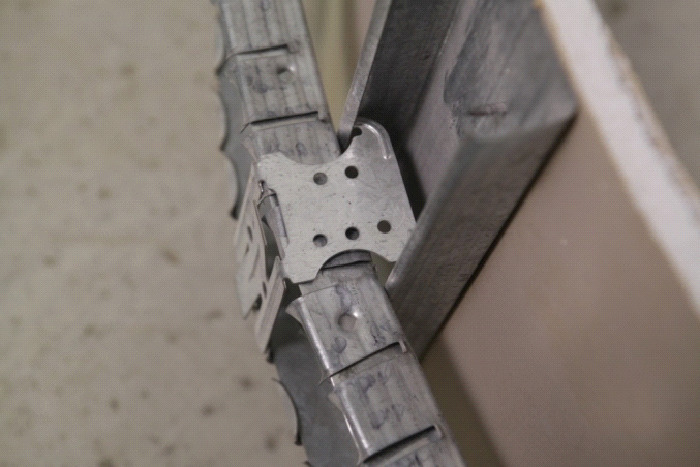 - Fixation pour une connexion à deux niveaux il est rarement utilisé lors de l'installation en raison de sa spécificité. Son utilisation est recommandée dans les cas où un plancher en bois est utilisé comme base. La construction métallique est double. Le premier niveau d'éléments galvanisés n'est pas fixé au mur (flottant). La deuxième couche de la structure est attachée à la première avec des connecteurs. L'installation d'une telle complexité est nécessaire en raison du fait que la base en bois est soumise à des changements de déformation (niveau d'humidité, conditions de température). L'élément de fixation compense ces vibrations.
