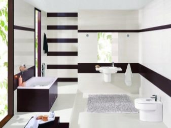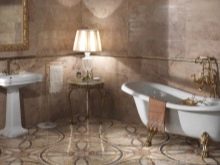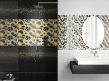 Pour la conception de la salle de bain, vous pouvez choisir une palette de porcelaine différente, des compositions contrastées au look original qui combinent plusieurs teintes à la fois. Il est beau de rendre le haut clair et le bas sombre. Une attention particulière est accordée aux dessins complexes et aux motifs disposés sur la tuile.