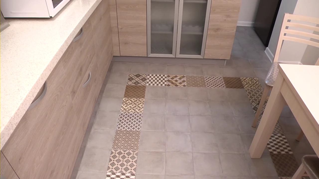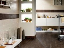 La solution initiale consistera en une nuance blanche de carreaux de porcelaine associée à un coulis brillant. Dans la cuisine, la tuile, agencée sous forme de marches ou de panneaux multicolores, semble inhabituelle. En ce qui concerne le revêtement de sol, la meilleure option serait un grès cérame imitant le stratifié ou le parquet.