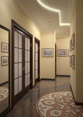 Un bon choix pour le couloir sera le granit, imitant la pierre naturelle ou le bois. Les tuiles marron et chocolat se marieront bien avec les meubles et rempliront la pièce d'une atmosphère chaleureuse. Dans ce cas, le sol peut être agencé dans une seule couleur et se combiner dans la composition de plusieurs textures et couleurs.