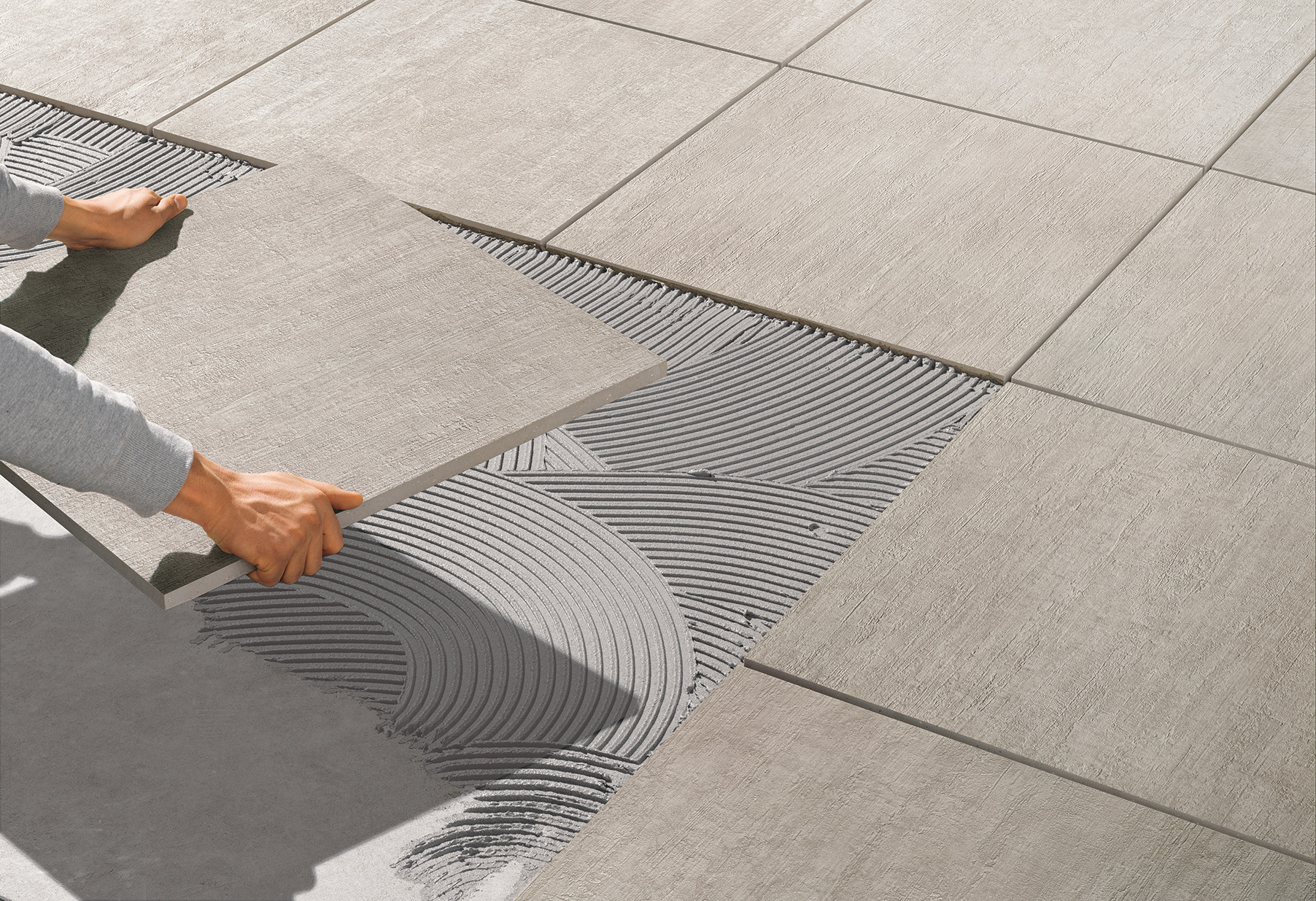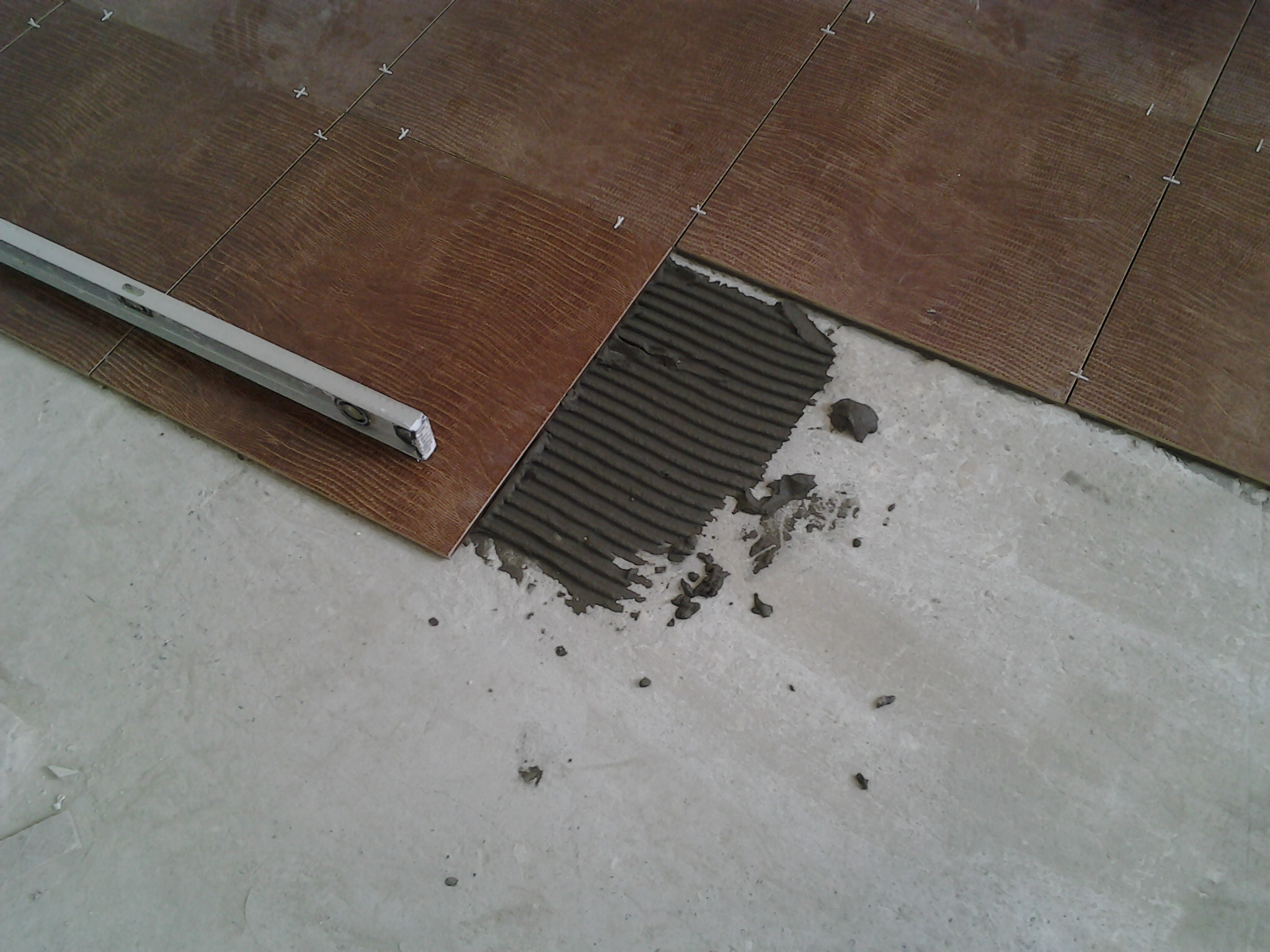 - Installation L'installation commence au centre de la pièce. La colle préparée est appliquée sur la base des carreaux et est uniformément distribuée à l'aide d'une truelle dentée. L'épaisseur de la couche dépend de la taille et de la densité du grès cérame: plus le produit est gros, plus la couche de colle est épaisse. Ensuite, la tuile est installée à la surface, bien pressée avec de la pâte et frappée dessus avec un marteau.