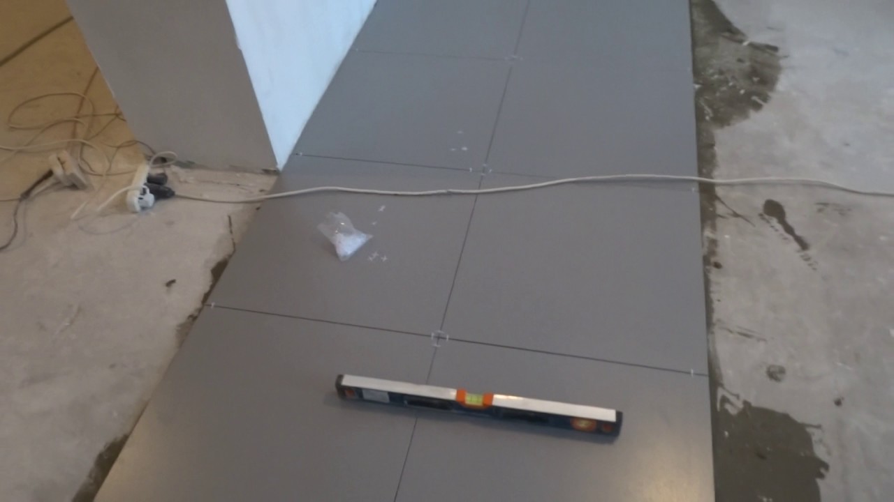 - La préparation. Tout d'abord, ils vérifient la surface sur laquelle ils vont poser le grès cérame. Si sur la base il y a des bosses, des transitions abruptes et des irrégularités importantes, l'installation ne peut pas être effectuée immédiatement. Dans ce cas, est faite de chape de ciment et de doublure, après quoi vous pouvez poser des carreaux.