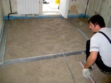 - À l’aide de profilés métalliques, il est nécessaire de délimiter la surface du sol pour obtenir des cellules uniformes qui s’endormissent avec de l’argile expansée. Ils seront ensuite attachés feuilles anti-humidité.