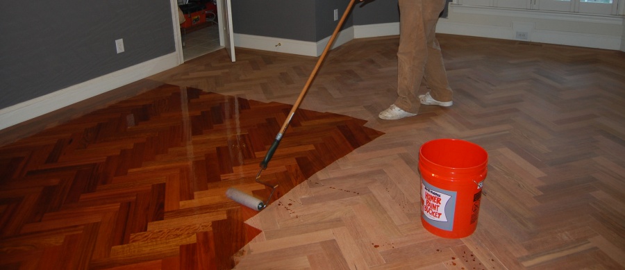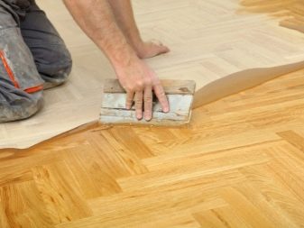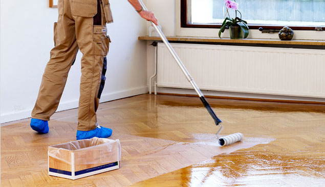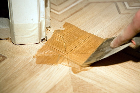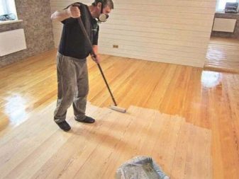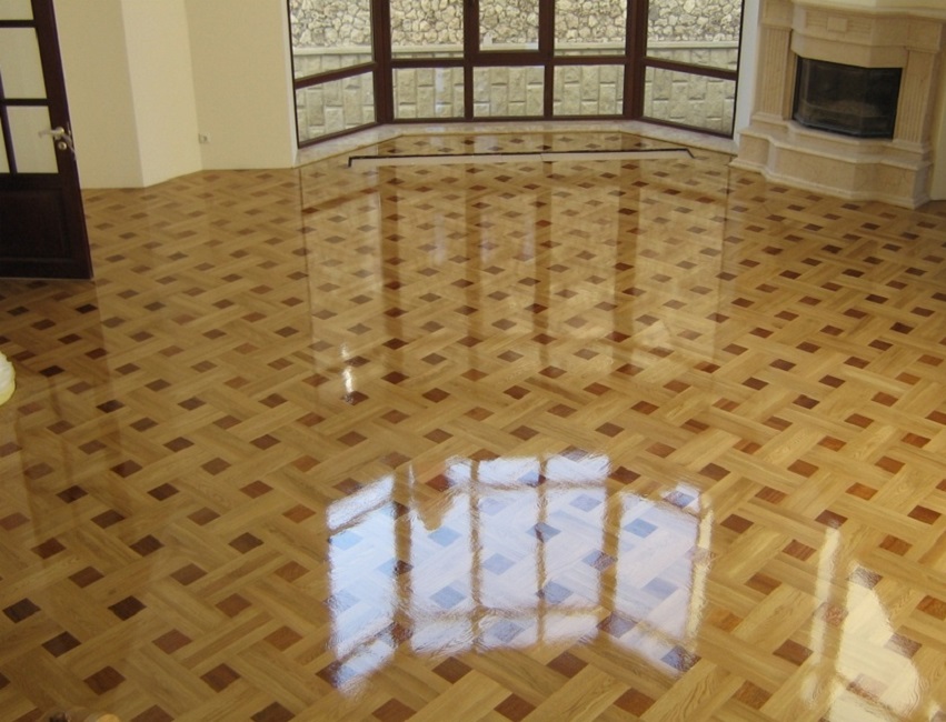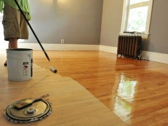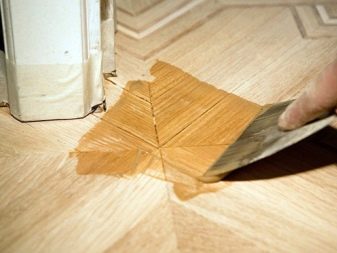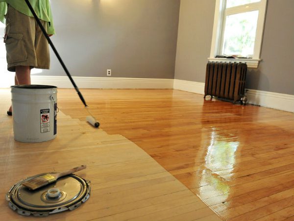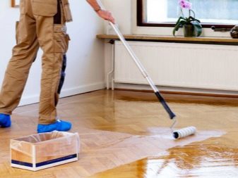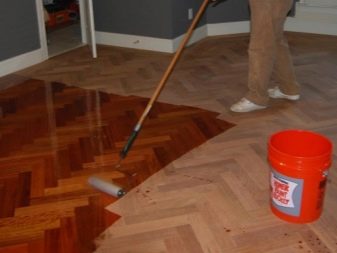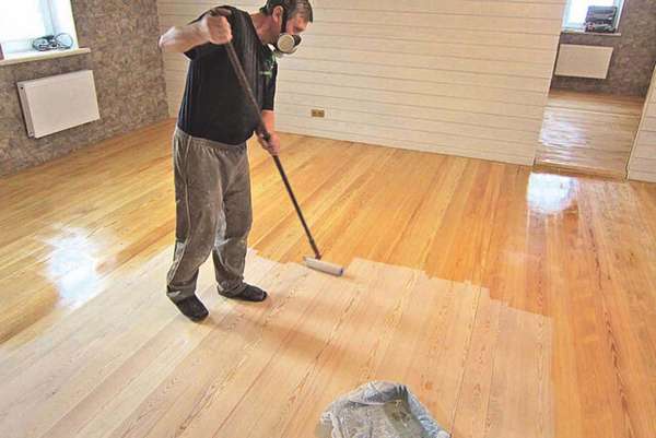 Une fois que le sol est poli, traité avec un mastic et débarrassé de la poussière, vous pouvez procéder au vernissage. Ce matériau est appliqué uniformément et doucement. Après avoir dessiné, il est nécessaire de fermer toutes les portes pour éviter que des animaux ou des enfants entrent dans la pièce.