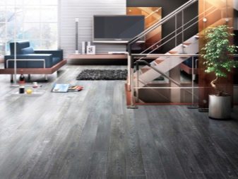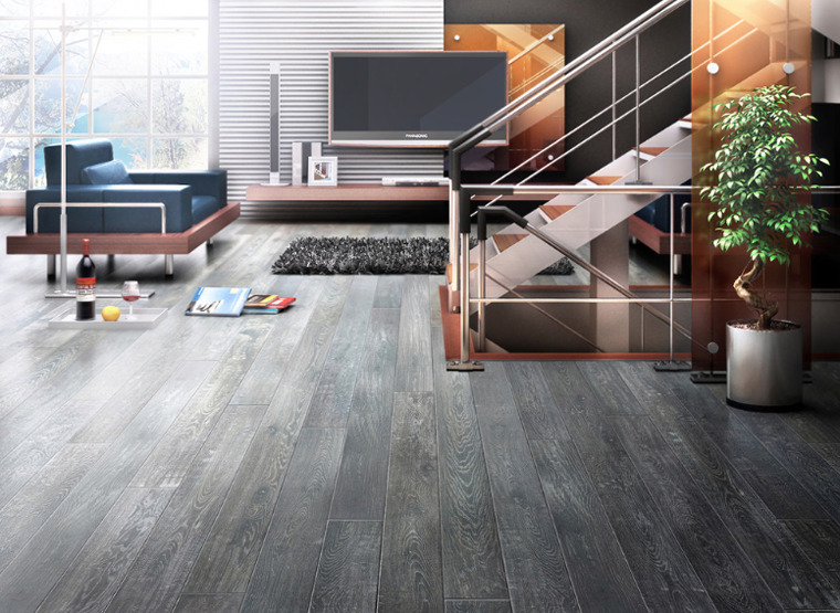 Le plus souvent, cette option de revêtement de sol est utilisée. sur la base des tendances classiques modernes (loft, haute technologie et minimalisme). La plupart d'entre eux sont laconiques et gris fait parfaitement l'affaire. La couleur se fond harmonieusement et harmonieusement dans l'intérieur sans se focaliser sur elle-même, à la différence du parquet noir et brillant.En raison de cela sur son fond divers défauts et irrégularités sont cachés. Il est à noter que le "vieux" parquet gris aura fière allure dans diverses directions décoratives ethniques.