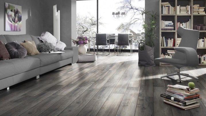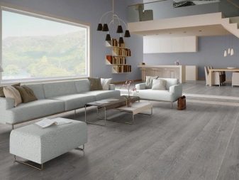 Gray est activement utilisé dans la décoration des appartements. C'est un classique intemporel, présenté dans différentes nuances. Si l’acheteur souhaite rafraîchir la pièce et la rendre plus visuelle, il opte pour le parquet gris clair. Si l'objectif est de rendre le décor plus strict et précis, vous pouvez choisir un matériau gris foncé.