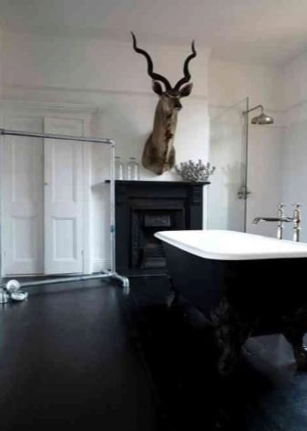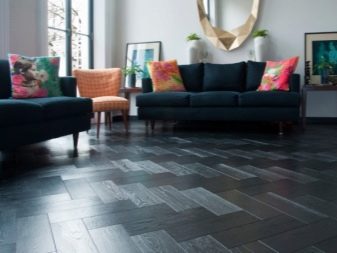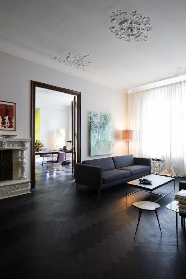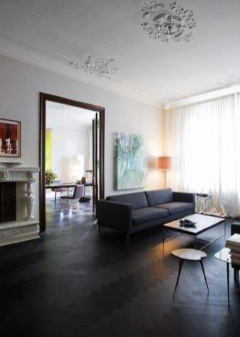 On sait que cette couleur, comme d’autres couleurs sombres, "mange" l’espace dans la pièce, de sorte que le parquet noir ne peut être utilisé que dans des pièces spacieuses. Il est également nécessaire d'installer un nombre suffisant de luminaires dans la pièce et de nuancer la couleur avec des éléments lumineux. Les meubles blancs sont particulièrement impressionnants sur le sol noir. Les sols noirs peuvent souvent être trouvés dans le style gothique.