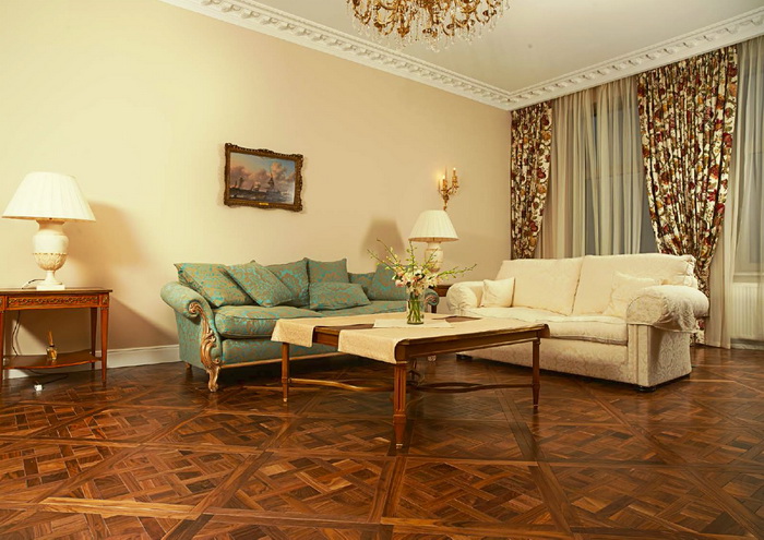 Le parquet «chaud» est le plus souvent utilisé sur la base du style de pays rustique.L'objectif principal de cette tendance décorative est de créer une atmosphère chaleureuse, confortable et relaxante dans la pièce. En outre, le plancher "chaud" est idéal pour le style classique.
