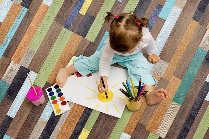 Des tons clairs et accrocheurs sont souvent utilisés pour concevoir les chambres d'enfants. Cette palette de couleurs développe la pensée créatrice de l'enfant et s'adapte au positif. Si l'intérieur semble fané, un parquet coloré aidera à résoudre ce problème. Si la pièce contient de nombreux éléments différents (peintures, photographies, figurines, etc.), les sols monochromes avec une finition brillante s'intégreront parfaitement à l'intérieur et équilibreront le décor. Les sols colorés sont un élément commun des styles modernes (kitsch ou hi-tech).