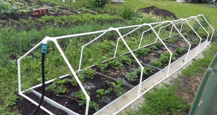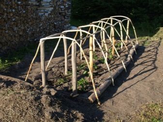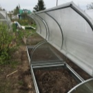 Tout d’abord, ils courbent les arches de manière qu’elles atteignent une hauteur de 1,5 à 1,6 m et une largeur de 1 à 1,2 m. La distance entre ces tubes verticaux doit être de 50 à 60 cm, l’espacement des rangs de 1 à 1,2 m, puis insérez les arches dans les tubes et attachez-les avec une corde. Pour augmenter la stabilité de la corde depuis les arcs d'extrémité, attachez les pieux dans le sol à une distance d'un mètre et demi de la structure. Recouvrez la serre avec le matériau de couverture choisi et pressez ses bords avec un agent alourdissant (vous pouvez simplement utiliser des pierres).