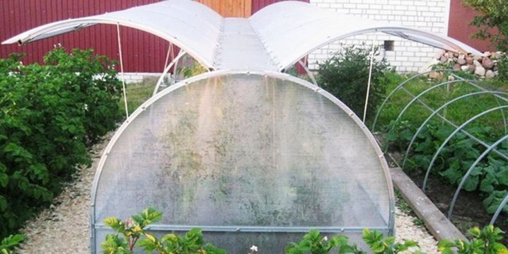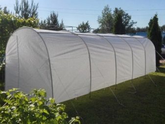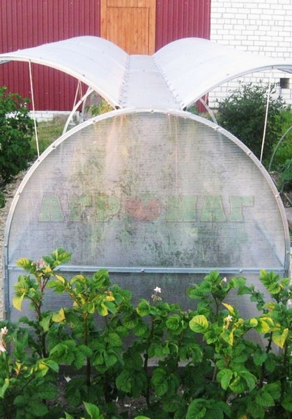 La configuration en arcade est très pratique, pratique et fiable. Il est généralement constitué d’agrofibre ou de spunbond. L'utilisation de ces matériaux a ses avantages: l'humidité ne se condense pas sous eux, ils permettent à l'air, à la lumière et à la chaleur de bien traverser. Ces structures préfabriquées peuvent être achetées auprès de nombreux fabricants de serres, mais vous pouvez le faire vous-même. Gardez à l'esprit que sa hauteur doit être d'au moins un mètre et demi, comme il est généralement cultivé de grandes variétés.