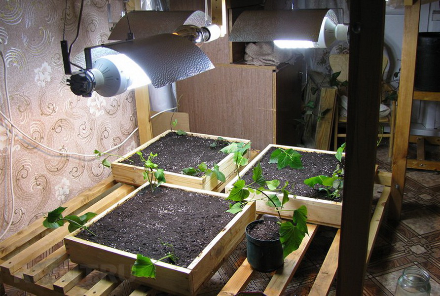 Sous la boîte, vous devez attacher un appareil pour le chauffage. - lampe à incandescence dans un boîtier étanche (de préférence en étain) ou un radiateur soufflant. Au zénith de la serre, installez fitolampu. Vous pouvez fixer des étagères en filet supplémentaires pour les pots de semis ou des jarretières pour les pousses en croissance sur des barres horizontales. La palette avec le sol pour les plantes est mise dans le fond. Avec des soins appropriés, les plantes plantées dans une telle serre apporteront une bonne récolte. Considérez que pour la culture de concombres à la maison, vous devez planter des espèces autogames.
