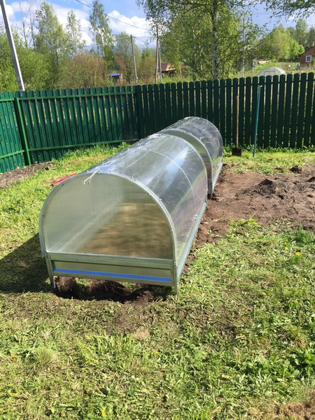 - "Gherkin" - serre cintrée sous le film. Le cadre est généralement constitué de profil galvanisé. Tailles standard - 5x1x1,2 m, des variations de longueur sont possibles. Le plus souvent, ils ne vendent que le cadre de la serre, sans matériau de couverture. Le «concombre» n’est pas une serre d’hiver, le film ou l’agrofibre doit être enlevé, sinon la masse de neige tombée pourrait la déformer.