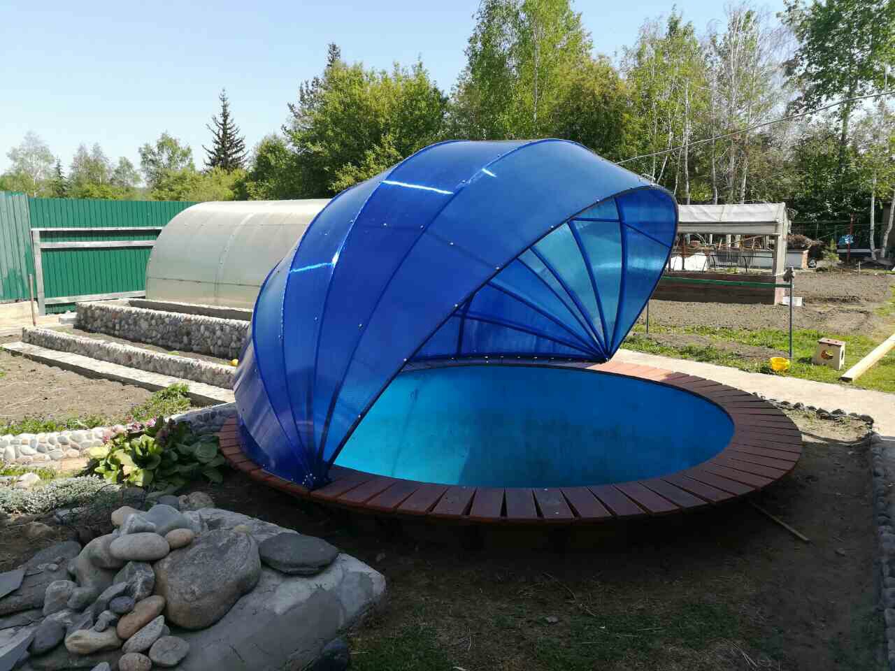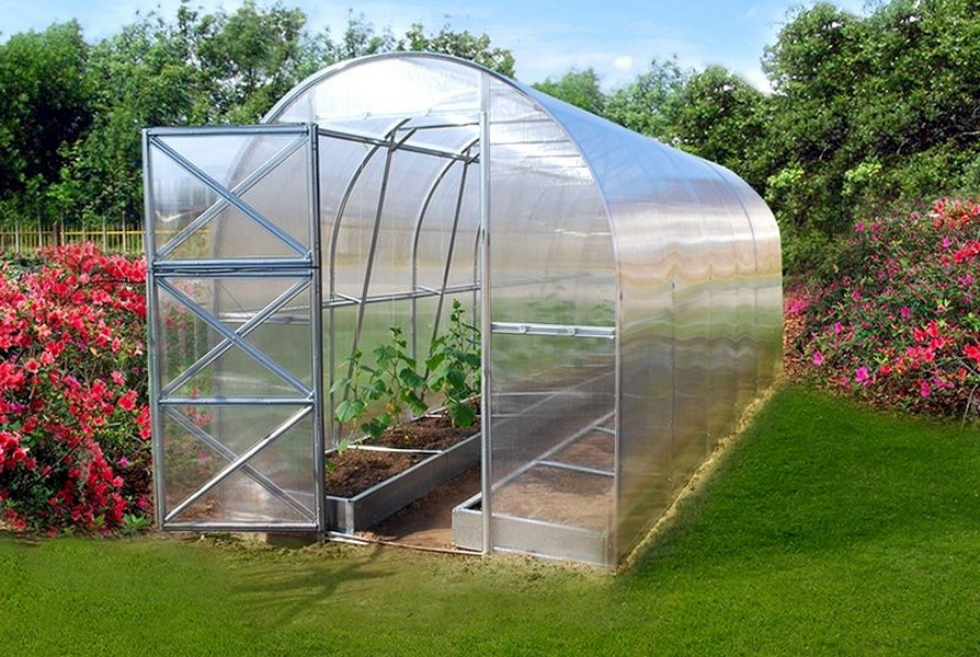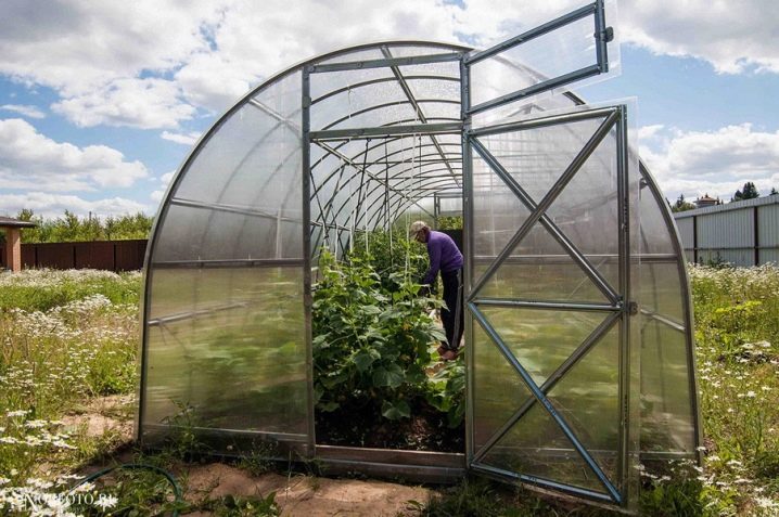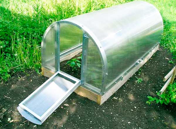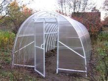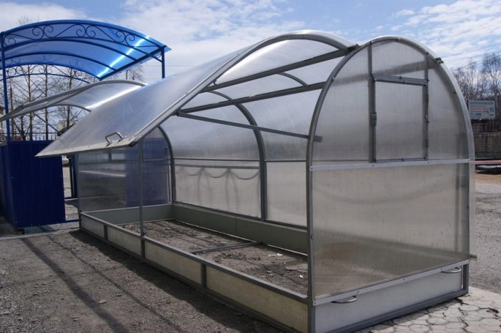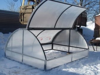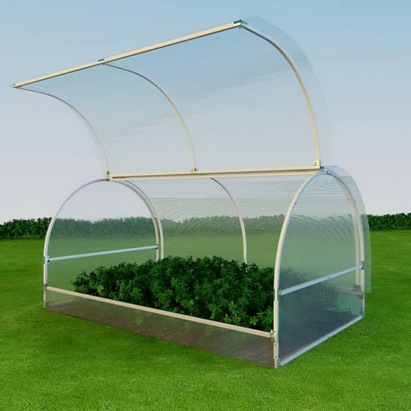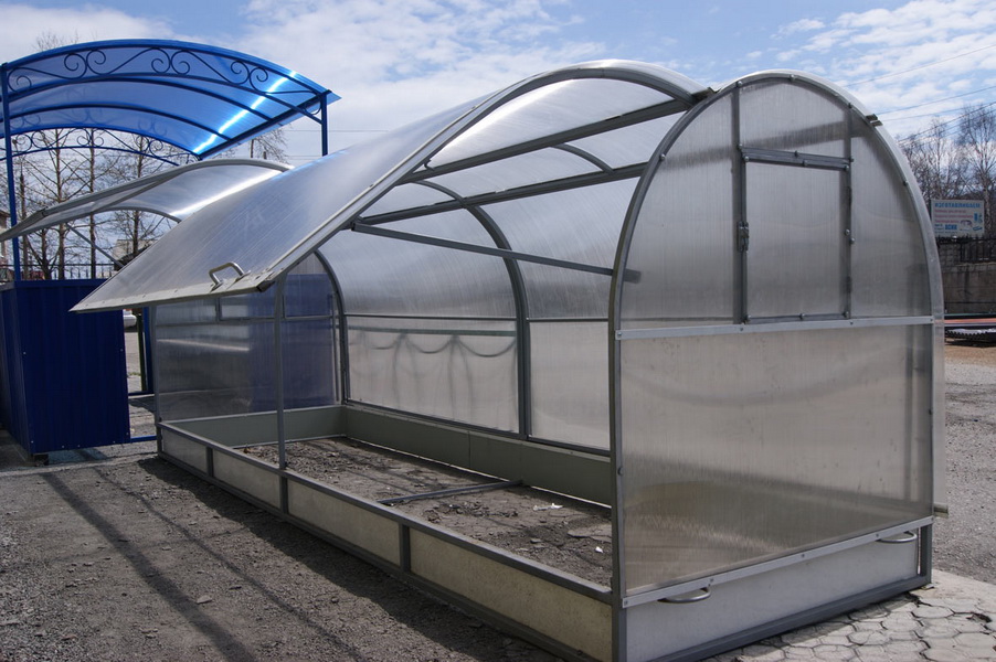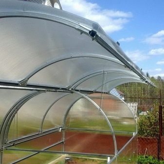 Au total, il existe plusieurs options pour les serres à ouverture supérieure. "Shell" est un objet qui a une section transversale du type de structure cintrée avec un sommet semi-circulaire. L'agriculteur peut, en ouvrant les portes, travailler avec les cultures directement à travers le toit coulissant sans escalier supplémentaire ni autre dispositif.