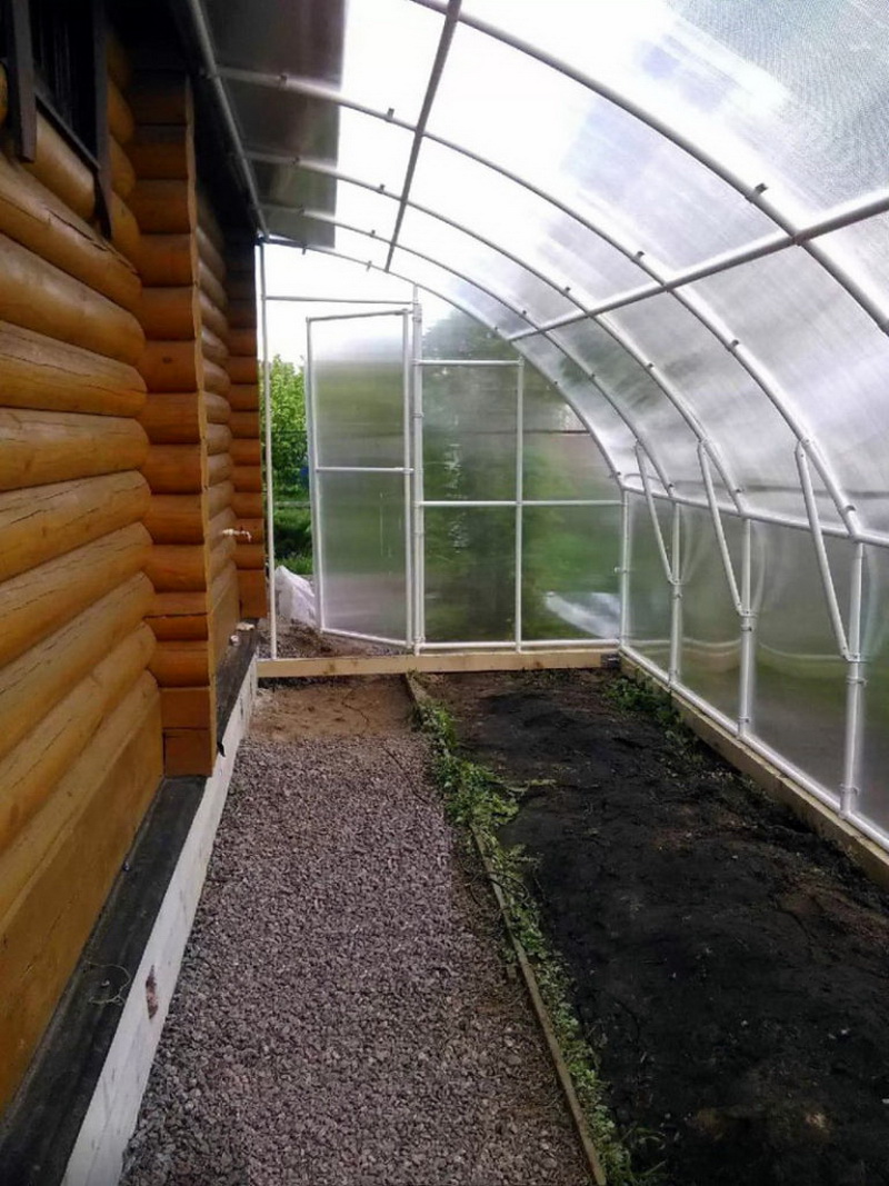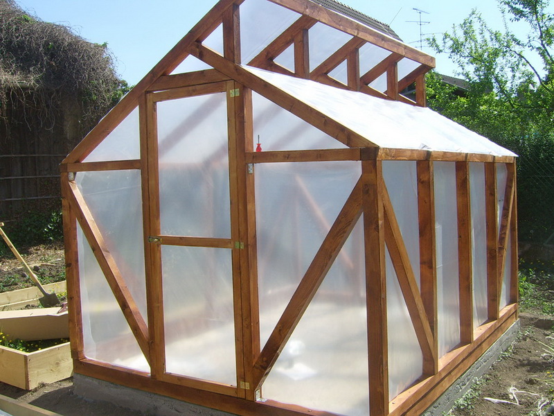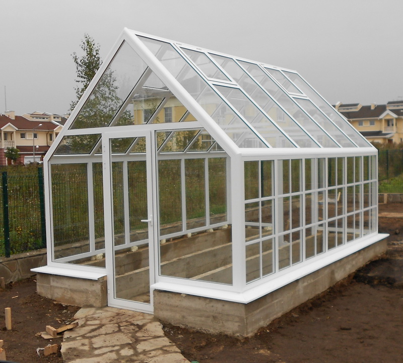 Les serres peuvent être à une ou deux pentes. Si le bâtiment est situé près de la maison principale ou du garage, il sera détruit. Le niveau de charge de neige en hiver dépend de l'angle d'inclinaison du toit. Plus l'angle d'inclinaison du toit est grand, moins la neige s'y accumulera lors de chutes de neige, ce qui signifie que le risque de déformation du toit diminue. Généralement l'angle d'inclinaison varie de 20 à 50 degrés.Les structures porteuses les plus souvent utilisées sont des angles métalliques. L'aluminium est préférable, il ne corrode pas et est relativement peu coûteux. La distance entre les structures porteuses ne dépasse pas un mètre.