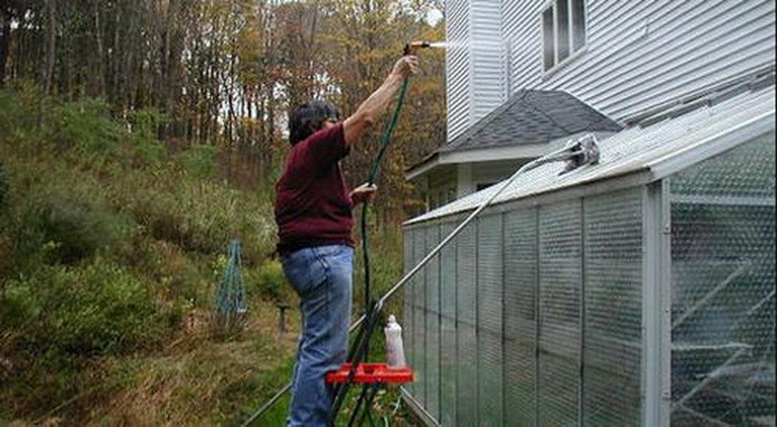 La serre de polycarbonate de pays exige des soins appropriés. Une fois tous les six mois, le toit doit être essuyé avec un chiffon humide imbibé d’eau savonneuse. Avant de commencer l'hivernage, chaque paroi de la serre doit être essuyée de l'intérieur avec une éponge imbibée d'eau savonneuse. Une attention particulière doit être portée aux joints et aux coutures. Dans ces endroits, les parasites pondent le plus souvent des œufs qui, au printemps, peuvent se transformer en larves. Il n'est pas recommandé d'ajouter du chlore à la solution de savon, cela pourrait endommager les plantes car c'est un poison puissant.