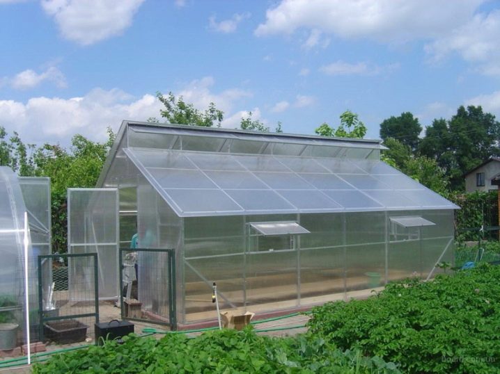 Si vous faites un toit en polycarbonate en appentis, son avantage sera qu'il est fait simplement et rapidement. Parmi les inconvénients, on peut appeler le fait que la surface utilisable est petite, l’éclairage laisse beaucoup à désirer.S'il y a un toit à effet de serre à double toit, l'éclairage est bien meilleur. Les éléments porteurs sont plus durables, mais la construction d'un tel objet est plus onéreuse et demande beaucoup plus d'efforts et de matériaux. Souvent, les jardiniers installent sur les toits de vieilles charpentes qui n’ont pas l’air tout à fait correctes et doivent en outre être régulièrement nettoyées de la neige en hiver.