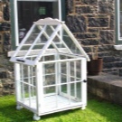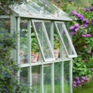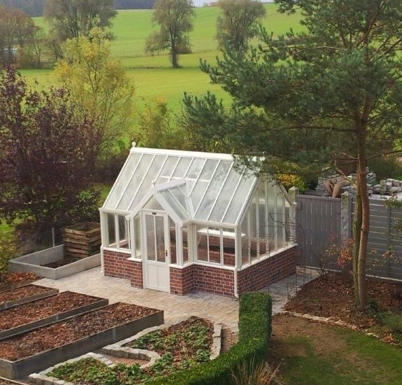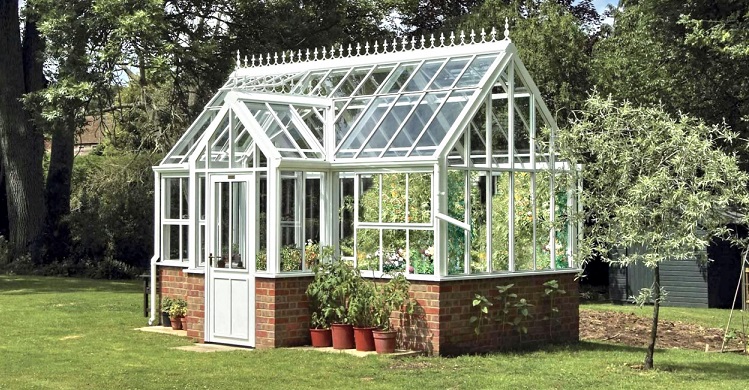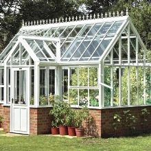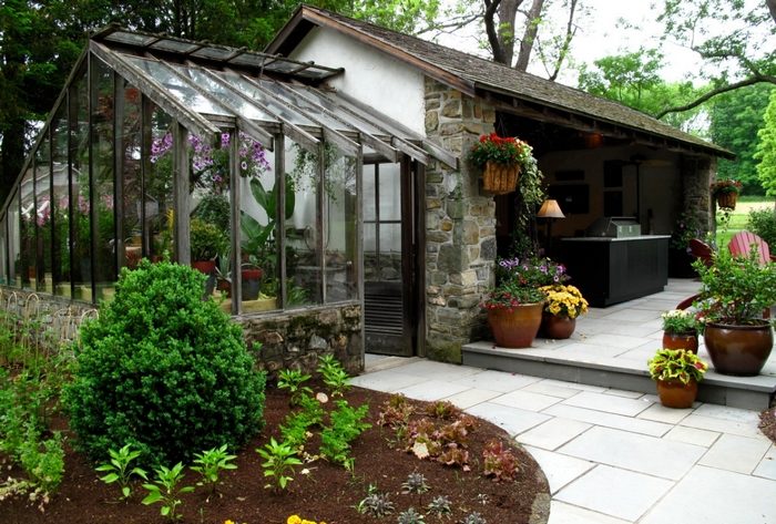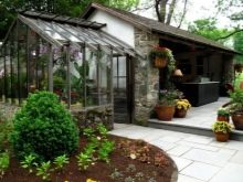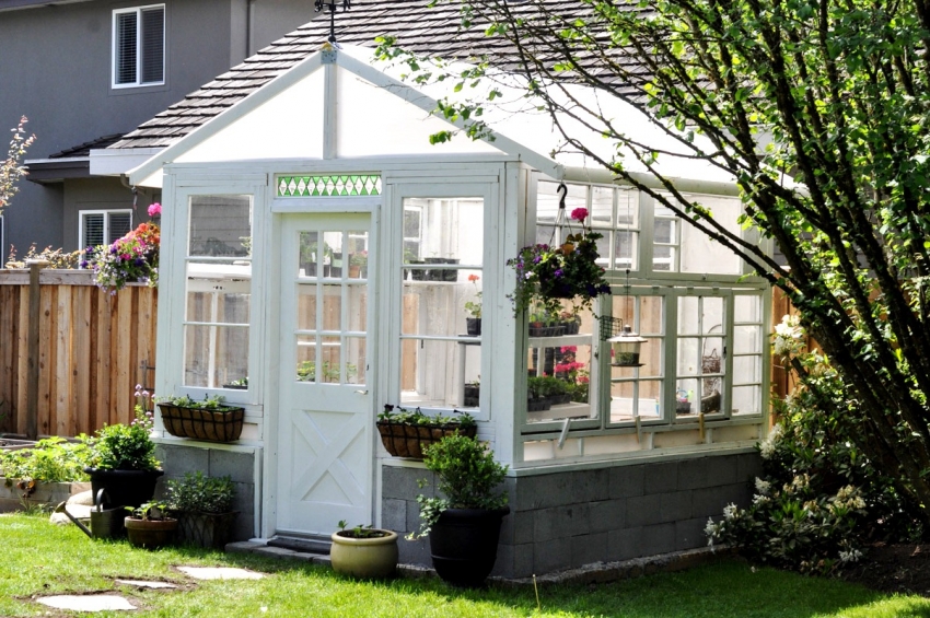 - Tout simplement magnifique sur le site ressemblera à une version haute en duo d'une serre composée de cadres peints à la peinture blanche. Sa partie inférieure peut être complétée par des briques grises ou des pierres apparentes. Il sera possible de donner à une serre un aspect plus vibrant et coloré à l'aide de pots suspendus avec de riches plantations de fleurs montées sur les murs.