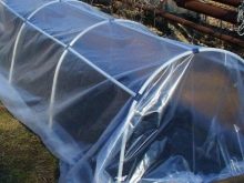 - Le revêtement le plus réussi d’une telle base va devenir populaire aujourd’hui en polycarbonate ou en film spécial de polyéthylène. Si vous avez choisi le premier matériau, vous devez savoir que son épaisseur ne doit pas être inférieure à 4 mm. Le paramètre de taille de la feuille peut être presque n'importe quoi, car le matériau spécifié est recadré de manière transparente si nécessaire.Il peut facilement être ajusté aux dimensions de la serre. Si vous prenez le film pour la finition, vous devez le couper en lanières et le fixer aux arceaux avec du ruban adhésif double face ou des attaches spéciales pour tuyaux.