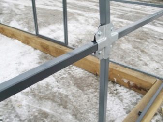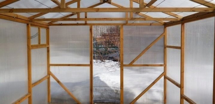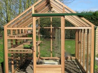 Le cadre de cette serre sera composé de crémaillères et de sangles inférieures. Ces derniers sont généralement constitués de planches de même taille. Dans le même temps, les éléments tels que les racks doivent être fixés à la même distance les uns des autres, de sorte que le cadre puisse facilement rester entre eux. Pour construire un toit, il est recommandé d'utiliser une barre, car elle possède de bonnes caractéristiques de résistance. En outre, avec un tel détail, la serre sera protégée des dommages causés par la neige en hiver.