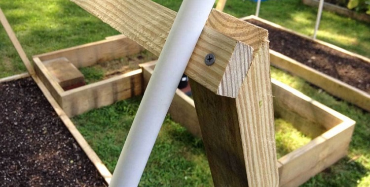 - Le long tube (ou 2 courts, mais attachés ensemble) devrait être au centre. Il devra être solidement fixé à l’aide de cordes ou de pinces. À ce stade, il est possible de considérer que l’assemblage de la base du cadre est terminé.