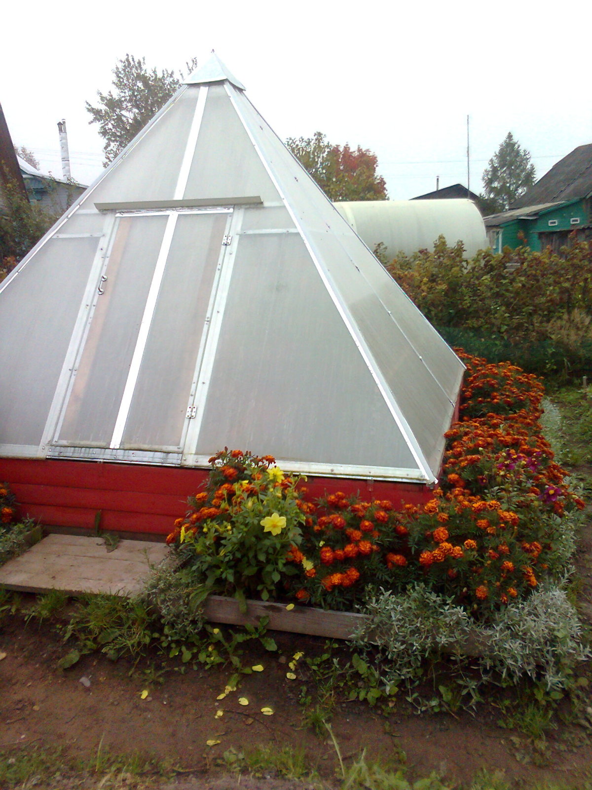 Un peu moins souvent, il existe des serres en forme de pyramide. Ils peuvent être très petits, assez grands et grands. Beaucoup d'utilisateurs sont sûrs qu'ils ne peuvent être décorés qu'avec du verre. En fait, pour cette installation, vous pouvez acheter un film ou du polycarbonate - le choix est réservé aux propriétaires.
