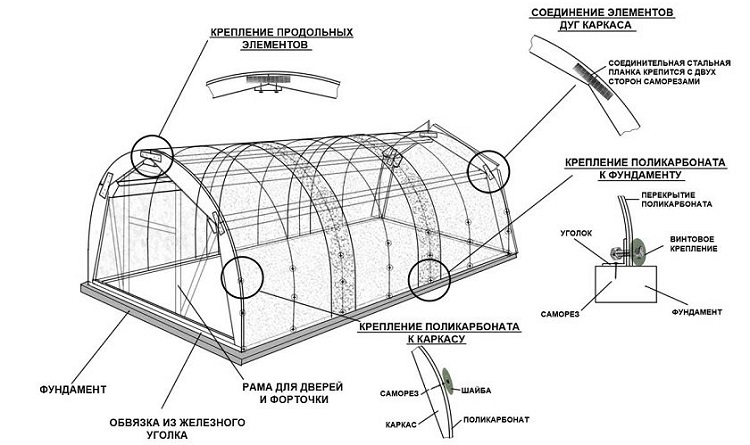 Dans ce cas, les travaux d'installation doivent commencer par l'installation du profilé de guidage. Il est fixé à la fondation à l’aide de vis. Une des poutres supérieures devrait servir de connexion pour toutes les sections. À leur tour, ils devraient être à une telle distance, de sorte que toute la structure soit aussi rigide et solide que possible. Habituellement, l’étape prend la troisième ou la quatrième partie de la feuille de polycarbonate. La serre galvanisée sous le matériau de couverture est réalisée de la même manière. Il est seulement important de penser à l'avance comment vous allez attacher le film à la base du cadre. Le reste du programme d'installation est le même que dans la fabrication de serres à partir de tuyaux en PVC.