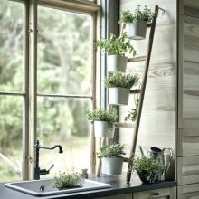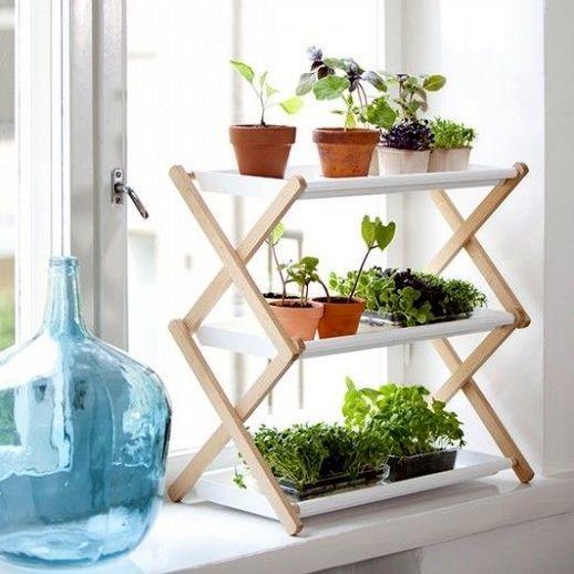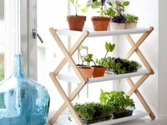 Ainsi, sur un rebord de fenêtre dans la même pièce bien éclairée, une structure pliante en bois avec trois étagères blanches comme neige aura un aspect organique. Sur chacun d'entre eux est d'organiser les plants dans des pots de nuances contrastées. Les couleurs claires associées aux capacités marron et les plantes vertes donneront une apparence fraîche et confortable.