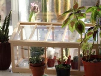 Sur le rebord de la fenêtre, vous découvrirez de spectaculaires serres de verre avec des cadres en bois clair en forme de petites maisons. Si vous faites ces options à partir de verre assez épais et fournissez un réchauffement supplémentaire pour les plantations à l'intérieur, dans de telles conditions, les plantes pourront porter des fruits toute l'année et ne gèleront pas en hiver.