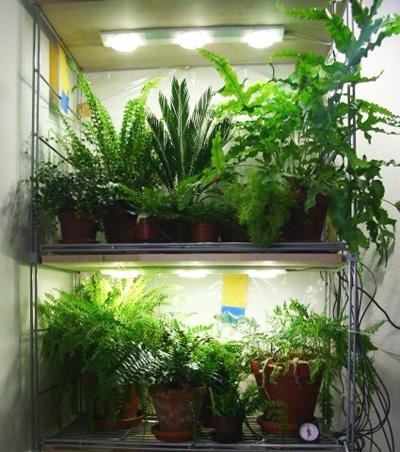 Une serre équipée sur un rack ouvert à plusieurs étagères sera beaucoup plus intéressante et lumineuse si elle est complétée par un rétro-éclairage de couleur magenta ou par des ampoules tièdes. Dans ce contexte d'éclairage artificiel, les plantes vertes à grandes feuilles auront un aspect plus saturé et luxuriant.