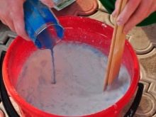Tout d’abord, vous devez bien diluer le mélange et connaître toutes les proportions. Pour préparer la solution à base de craie, il faudra 5 litres d'eau. Il est recommandé de prendre de l'eau tiède afin que les ingrédients soient effectivement dissous. Dans un récipient avec cette eau devrait être ajouté 3 kg de craie. Ensuite, 30 grammes de colle sont ajoutés au mélange. Il est conseillé d'ajouter un peu de bleu dans la solution. Cela donnera au plafond un air frais et se débarrassera de la nuance jaune. La quantité de bleu recommandée est comprise entre 15 et 20 grammes, en fonction de la nuance de plafond souhaitée.
