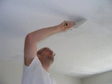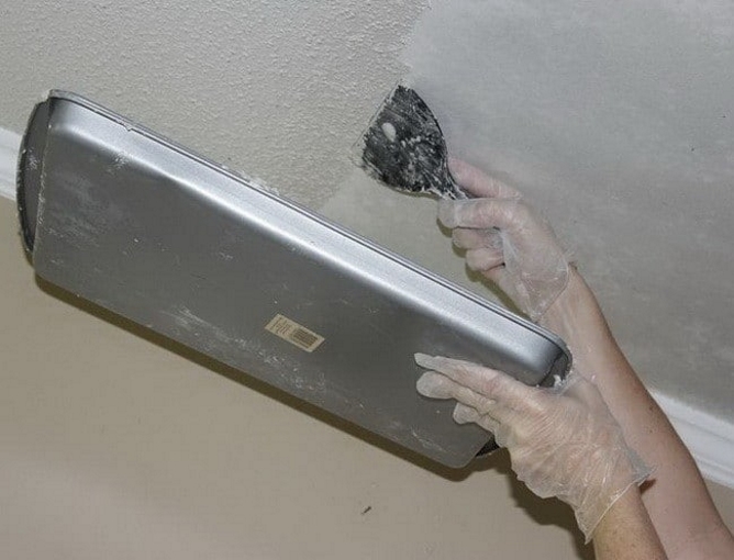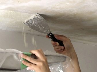 Si l'ancien revêtement est constitué de chaux, il sera un peu plus difficile à enlever. Pour ce faire, vous devez d’abord mouiller la surface du plafond afin de l’abaisser à la chaux. Pour cela, il est recommandé d'utiliser un spray. Ensuite, les couches de l'ancienne finition sont nettoyées à la spatule. Une fois les travaux terminés, il est recommandé de rincer la surface du plafond avec un chiffon pour éliminer les traces de calcaire et de poussière.