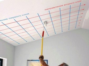 Il est recommandé de diviser le plafond en bandes séparées, sur lesquelles seront appliqués des couches de badigeon.Sur les connexions des bandes sont effectuées des chevauchements. Cette technologie empêchera l'apparition de lieux non teints.
