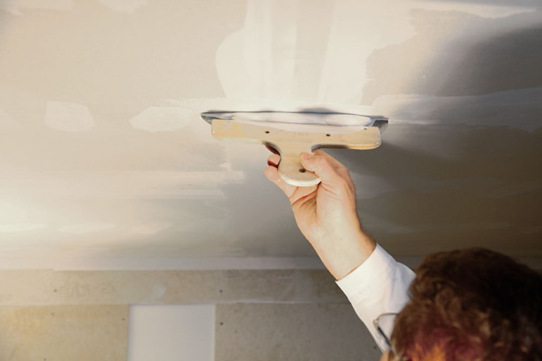 Pour la préparation du mastic, il faudra 1 unité de craie et 2 unités de gypse et de colle. Tout cela est mélangé dans de l'eau, après quoi le mélange résultant doit être appliqué aux endroits défectueux du plafond.Quand il sèche, la surface doit être traitée avec du papier de verre. En outre, la surface du plafond est sujette à un apprêt, simplifiant ainsi le blanchiment à la chaux, et les caractéristiques d'étanchéité à l'humidité sont améliorées à proximité du plafond. La surface traitée devrait se dessécher pendant la journée.