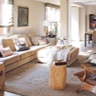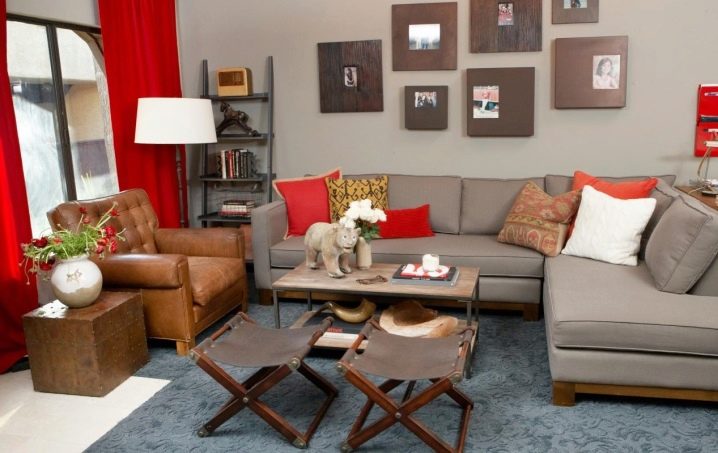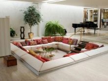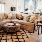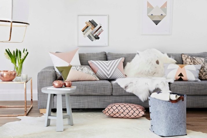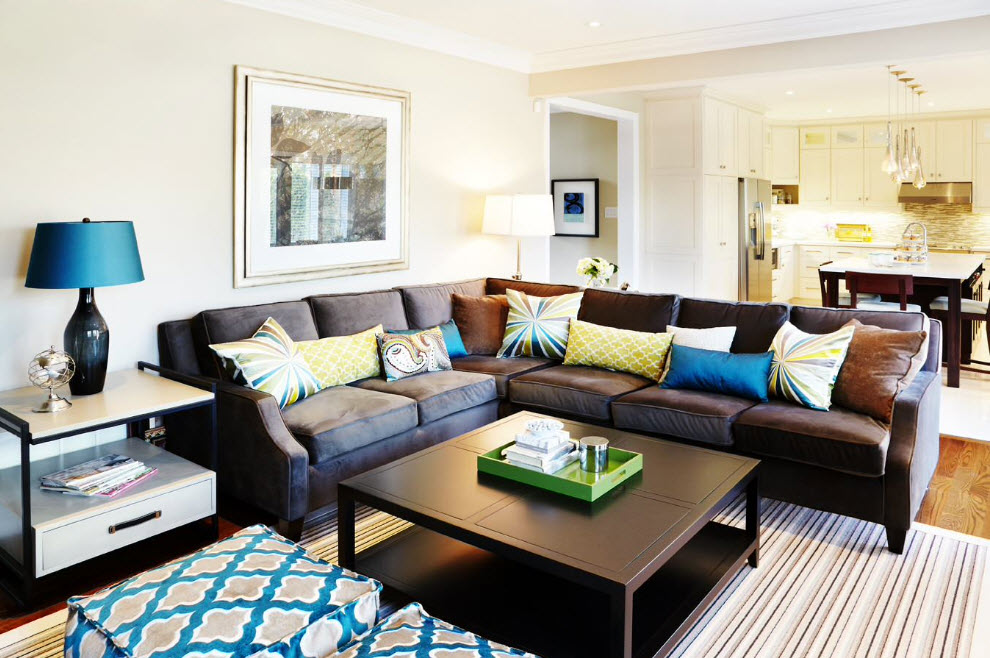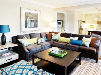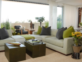 - Des produits arrondis ainsi que des produits rectangulaires standards sont placés sur le canapé d’angle. Cela vous permet de masquer visuellement la géométrie de ce type de mobilier et de le rendre plus confortable à utiliser (les coins du canapé ne s'enfoncent pas dans le corps lorsque vous êtes assis dessus).