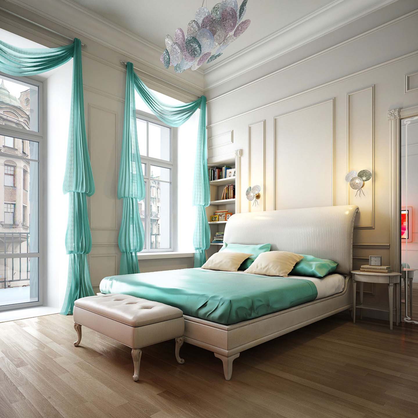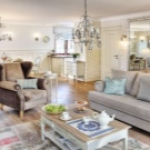 Le salon, décoré dans des tons pastel, peut être brossé en toute sécurité avec des accents turquoise vif sur le canapé et les fauteuils. Le ton gris terne, qui s’est avéré prédominant dans la pièce, est bien ombragé par des éléments décoratifs roses, d’autant plus que la couleur rose poudrée est la couleur tendance.