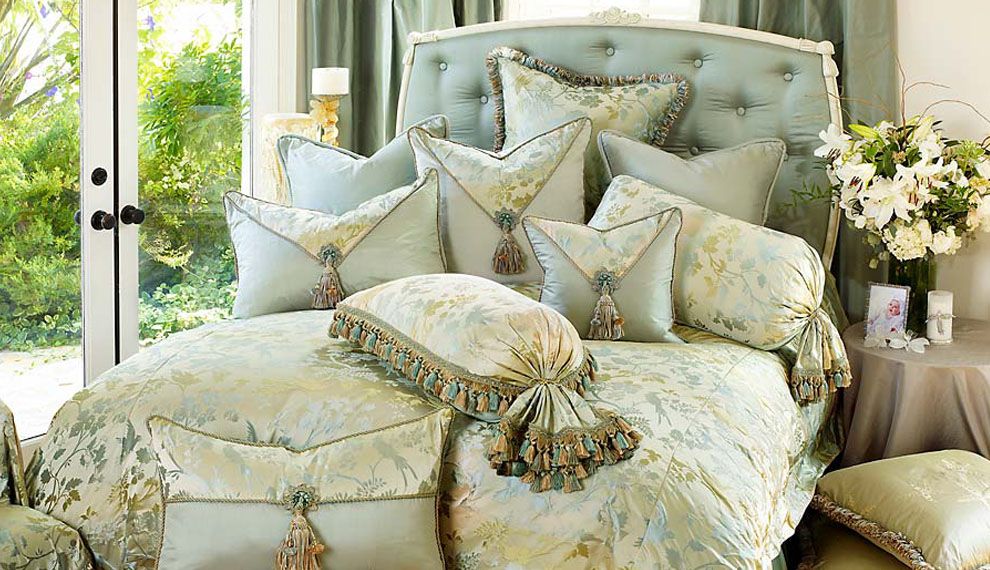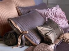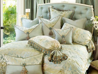 Textiles pour les couvertures décoratives utilisent uniquement naturel. Les taies d'oreiller en lin, en soie et en coton sont préférées. En ce qui concerne les éléments de décoration des oreillers, les matériaux synthétiques sont autorisés ici. Lors du choix de la couleur du produit, vous devez faire attention aux tons pastel, aux couleurs douces et sableuses, cendré, beige, rose pâle ou bleu.