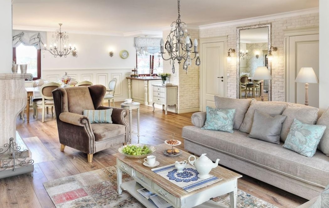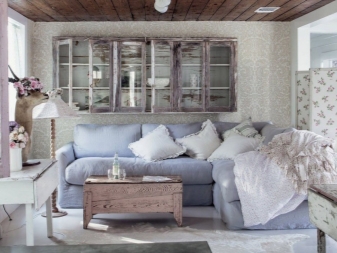 Ici, il y a aussi des éléments tels que des volants et des volants avec des dentelles, des plumes, des glands. Un oreiller décoratif, brodé de perles ou de paillettes, sera un ajout brillant au salon en style campagnard.