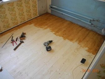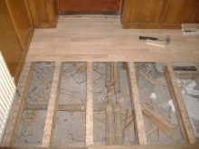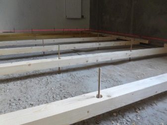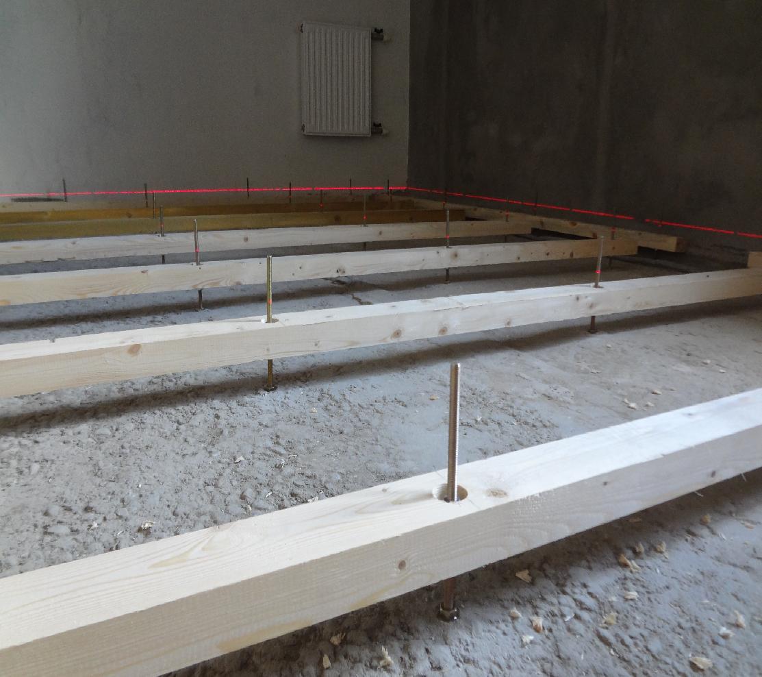 Les produits rainurés en bois peuvent être posés soit sur des rondins, soit sur des supports spéciaux (ce qui soulèvera la couche supérieure du sol de 7 cm au-dessus de la base). Mais si une pièce avec des plafonds bas, il faudra mettre du contreplaqué, afin de ne pas trop absorber de la hauteur. Les poutres de soutien sont utilisées lorsque le sous-plancher est trop inégal.L'épaisseur de chaque poutre est d'au moins 10 cm.