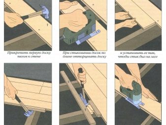 Il est possible de fixer une planche à feuillure avec les mains propres «au visage». C’est une technique très fiable, mais pas trop élégante. Les fixations sont enfoncées à l'avant de la planche, une paire de vis auto-taraudeuses est utilisée de chaque côté, une distance de 50 mm doit être respectée par rapport à la bordure. Si vous le fixez à la rainure (en tournant la vis dans la partie inférieure de la rainure selon un angle de 45 degrés), le chapeau devra être enfoncé plus profondément dans l’arbre. Seule une telle condition vous permettra de mettre en toute sécurité les conseils suivants. L’inconvénient de cette approche globale simple est risque de fendre les planches si elles s'avèrent être bouclées.