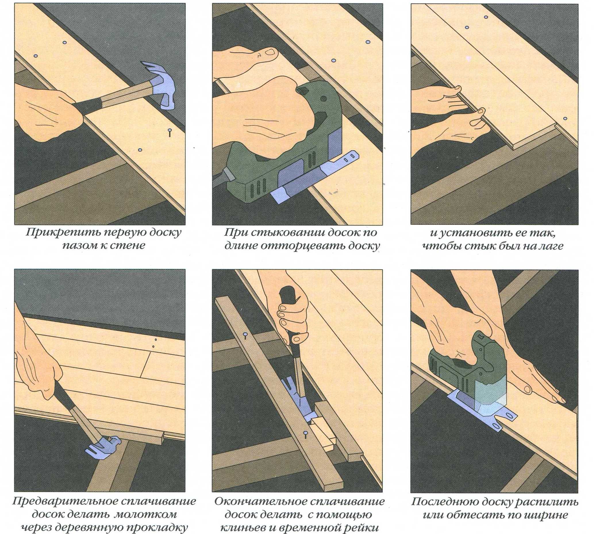 Fixation standard - sur les clous, vis parfois utilisées. Prenez un clou en acier flexible pouvant supporter des charges importantes. Même si la planche est pliée, les attaches ne se briseront pas. Mais martelez les soigneusement, en contrôlant soigneusement le résultat. Après tout, extraire un clou similaire sans casser le sol est très difficile.